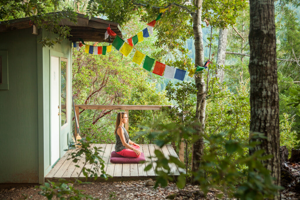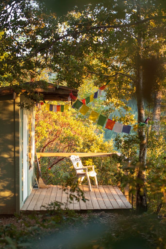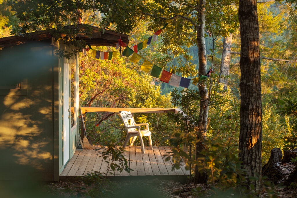 Our Cliff Retreat Hut offers retreatants the opportunity to practice in near total isolation. Positioned on the edge of a cliff with stunning views of the Gomde River Valley, you can expect misty mornings and golden sunsets. While the seclusion is valuable and the views are breathtaking, please keep in mind that the accommodations are simple and rustic, and it will likely be cold and rainy during the winter months. The cabin does not have electricity nor heat, and shared restrooms and showers are a short walk down a forested trail to our campground facility. There is a filtered drinking water station just outside of the hut.