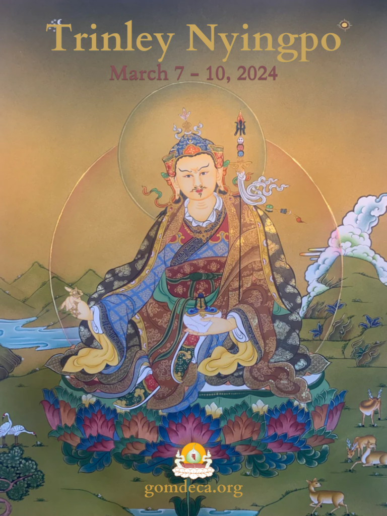 The Tukdrub Barche Kunsel Guru Rinpoche empowerment is not required to attend this retreat, but it is required if one wishes to make the Trinley Nyingpo their daily practice. Please note that this empowerment was offered by Chokyi Nyima Rinpoche during his Annual Seminar at Gomde California in 2019 and 2023, as well as by Dzigar Kongtrul Rinpoche during his Lamrim Yeshe Nyingpo program in 2018.