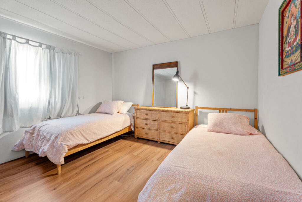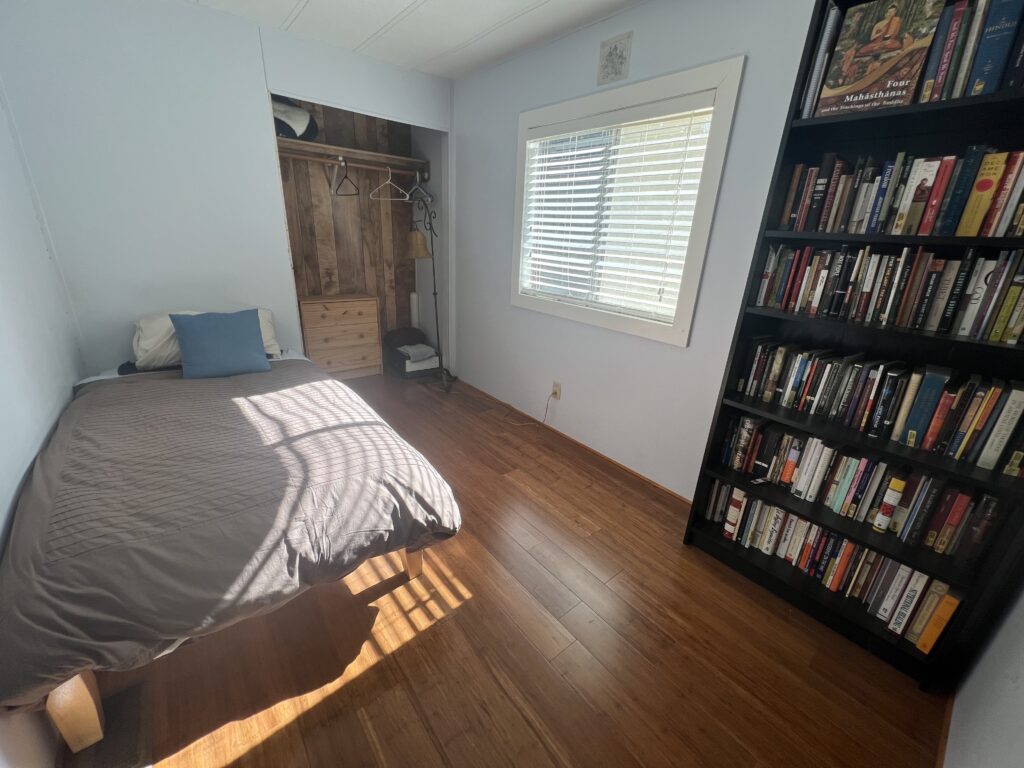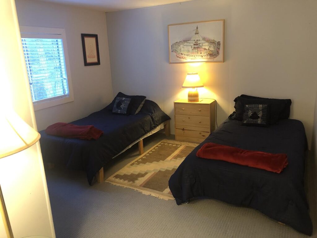 The Middle Room in the Gate House has two twin beds and access to a shared bathroom and kitchen. The Gate House is located at the top of the land near the entrance to Gomde, a short walk from the Sangha House.