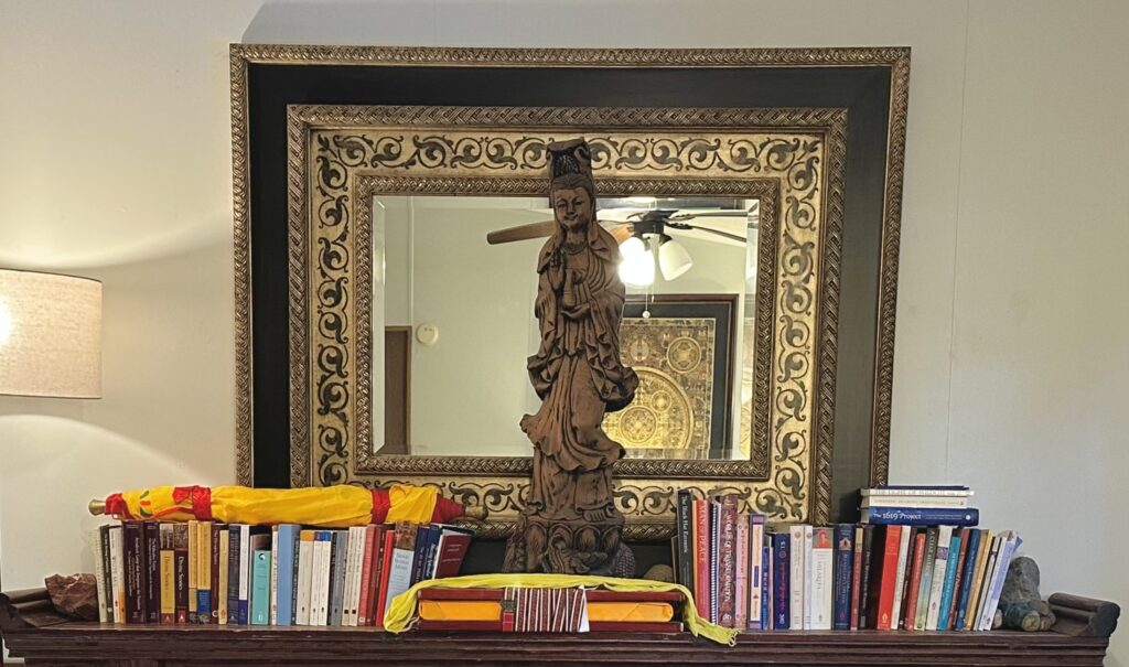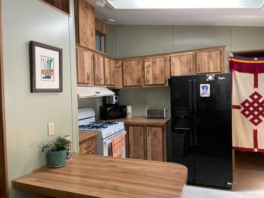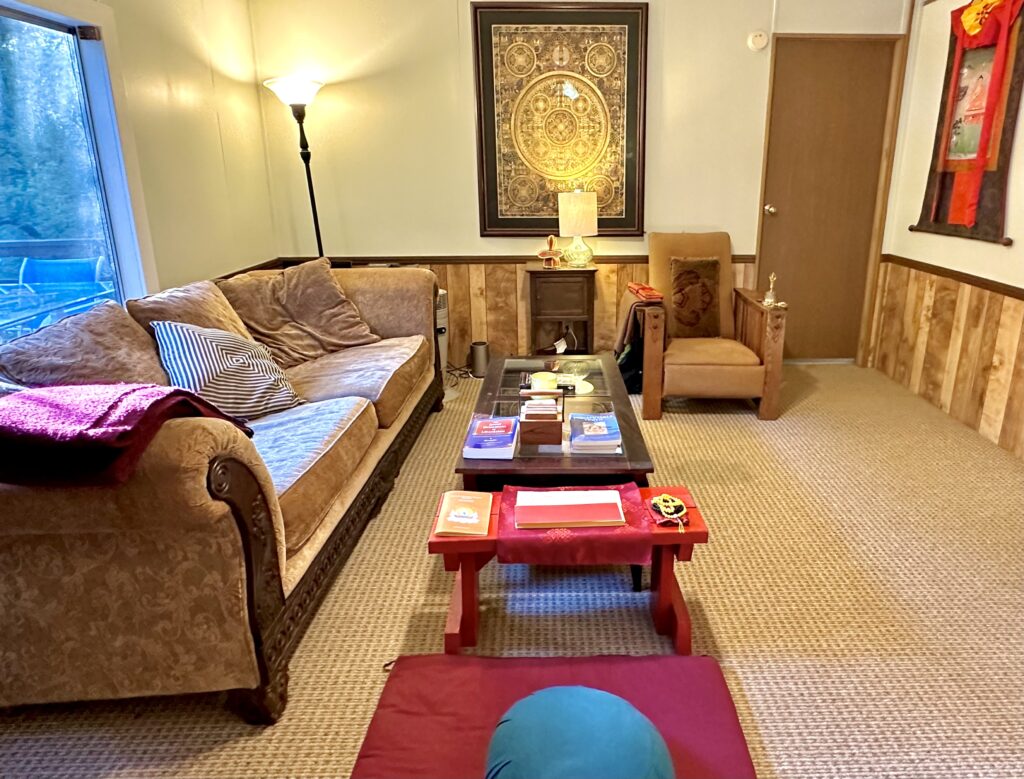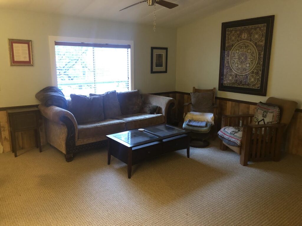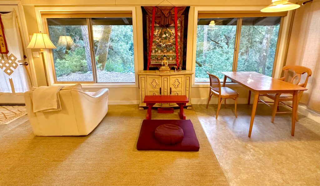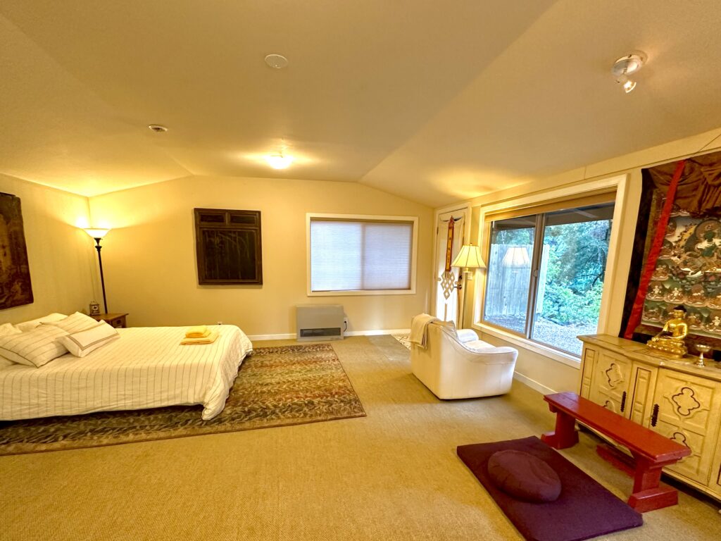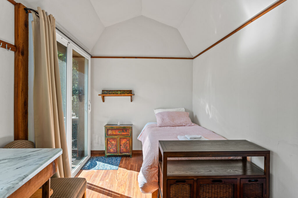 During group retreats in the colder months, our Buddha Hall is transformed into a mixed-gender dormitory for retreatants. Each person is provided with a pop-up privacy tent for sleeping, a twin-size mattress, and bedding. The Buddha Hall is equipped with heating and cooling for comfort. It’s just a short walk to the Shower House, restrooms, and central kitchen. Please note that this dorm also serves as a space for teachings and practices, so it remains a public area.