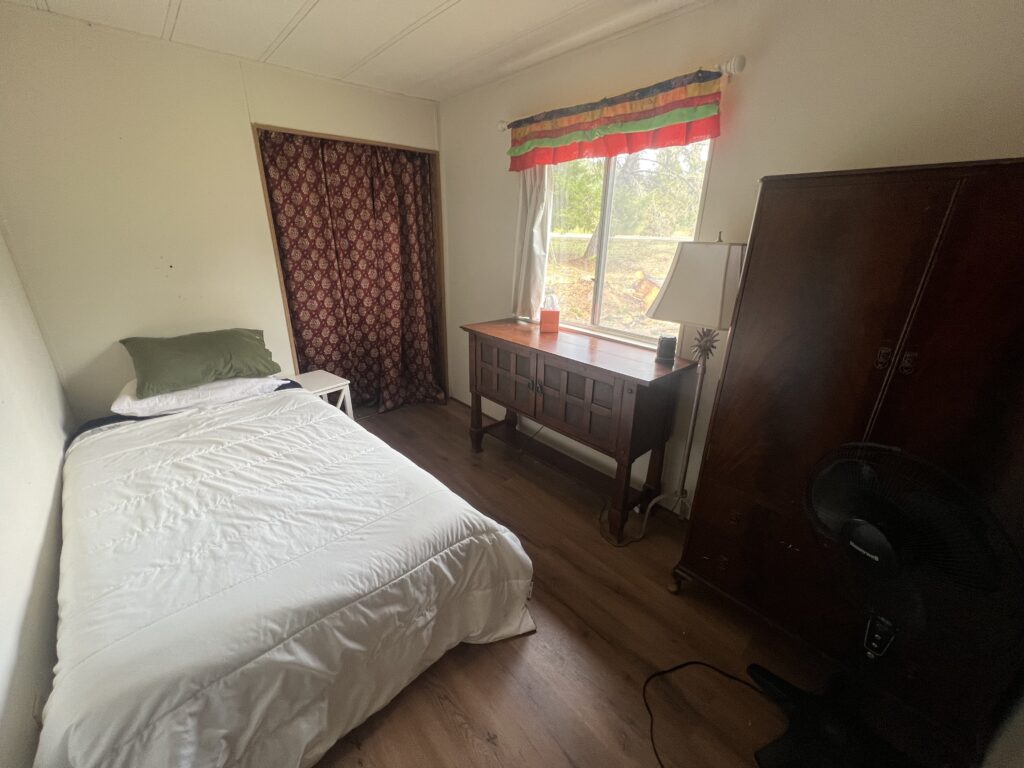 The Small Room in the Gate House, located at the top of the land near the Sangha House, is a simple sleeping space for a single guest. It has access to a shared bathroom and kitchen.
