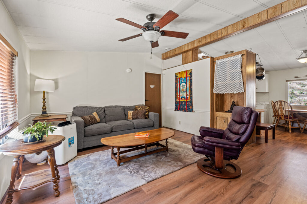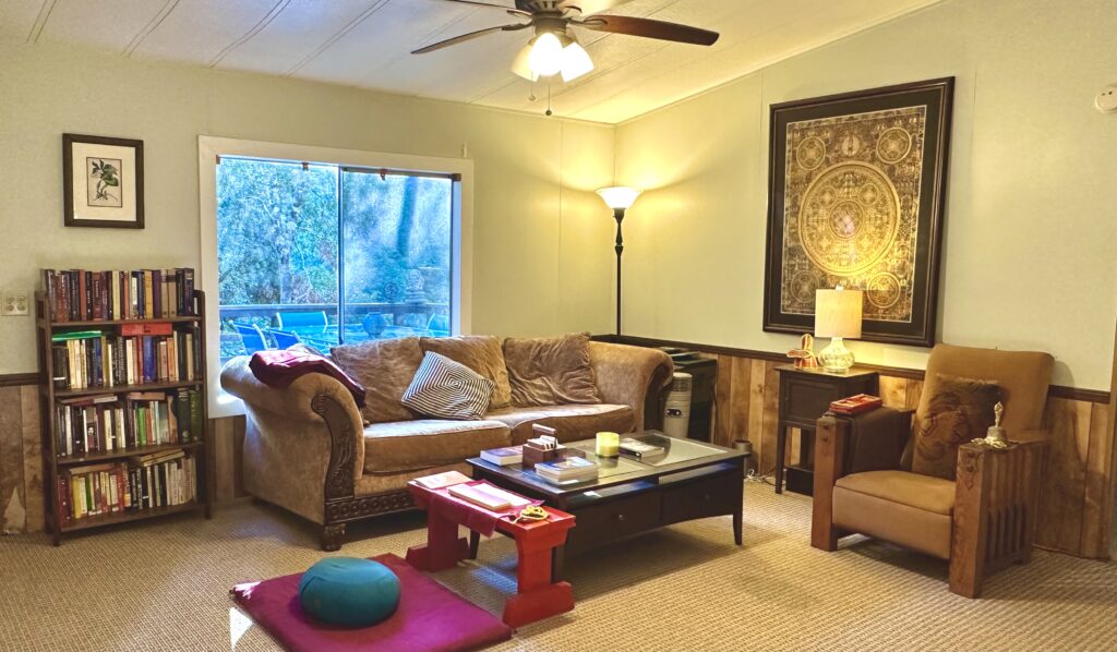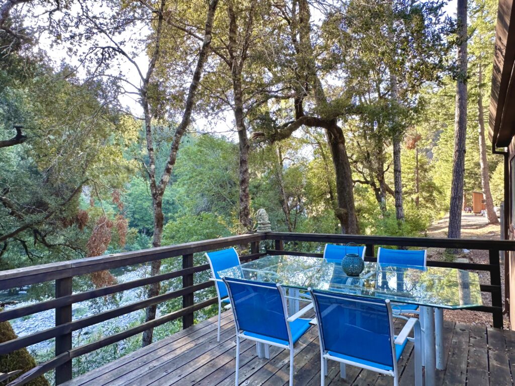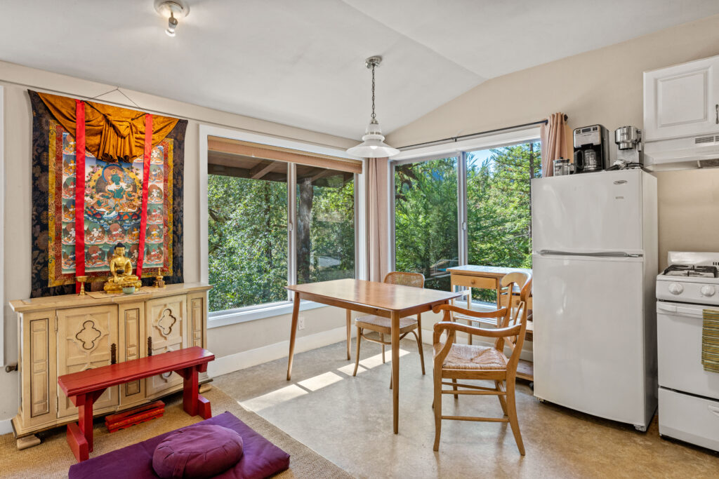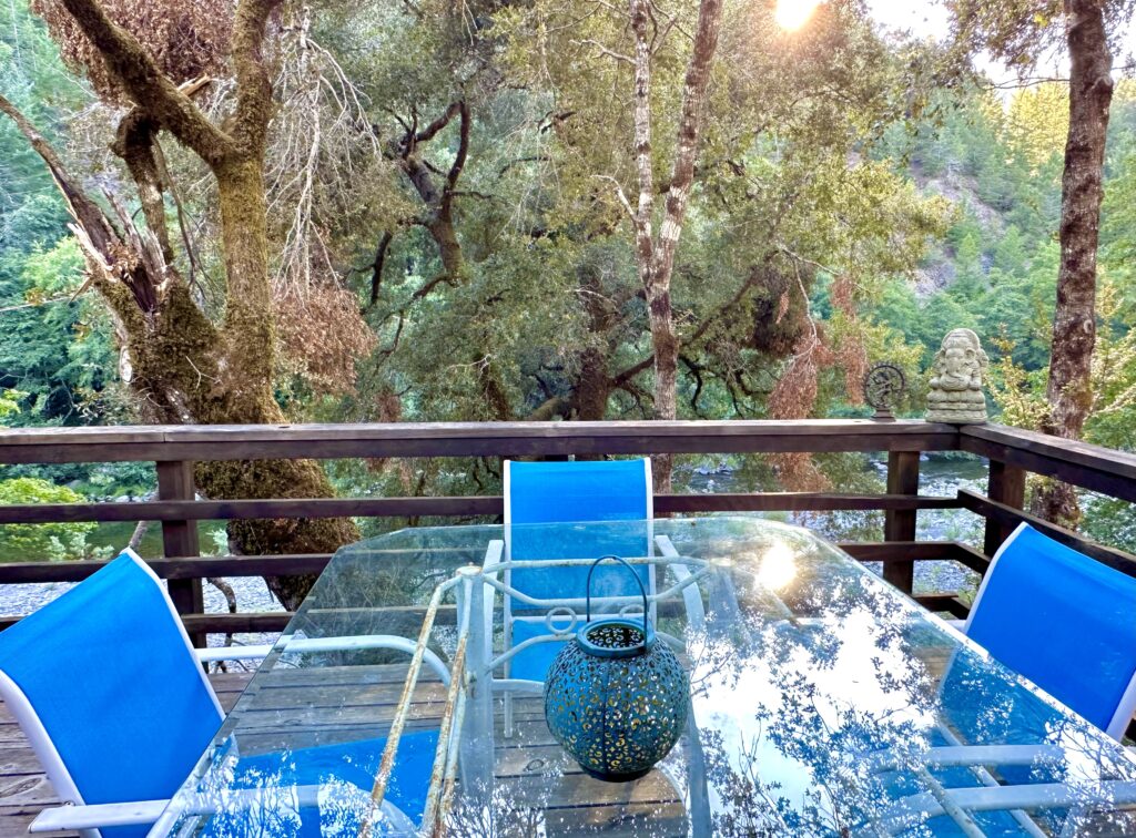 It is a three-bedroom, two-bathroom house with a back deck overlooking the Eel River. With kitchen and laundry facilities, it is perfect for individual and group retreats.