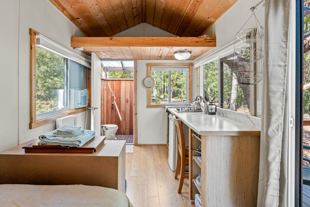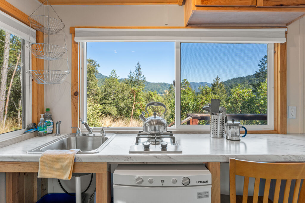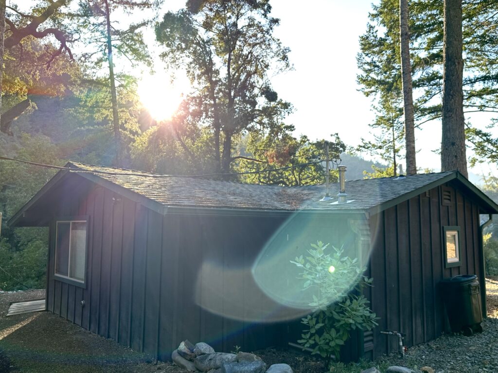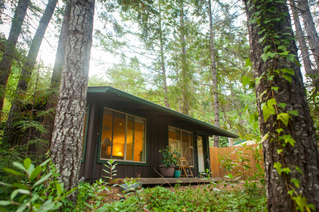 The Tara Cottage is a double-occupancy cabin with large windows opening onto the forested banks of the Eel River. Completely self-contained, this studio space has a full kitchen, bathroom, and closet space. The Tara Cottage offers the ideal setting for short or extended periods of quiet personal retreat.