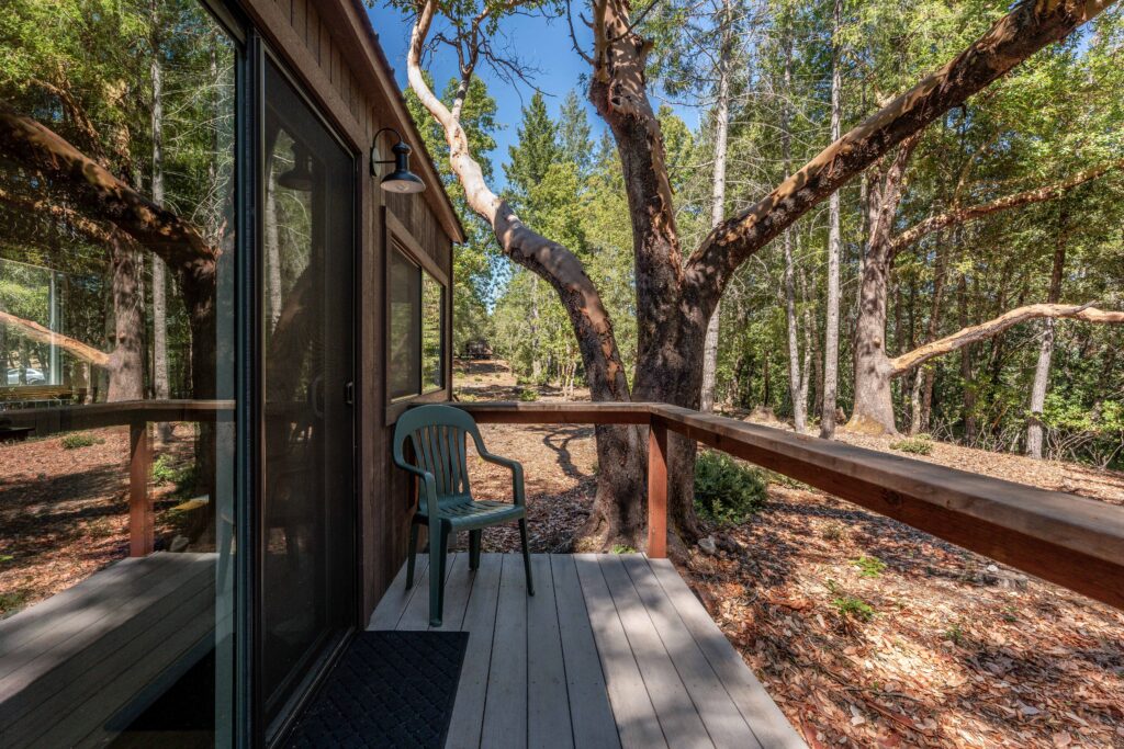 This cozy retreat cabin features a full-size bed and a dresser, along with a shrine cabinet, kitchen equipped with a dual-burner stove and mini-fridge, and an attached bathroom with a rustic shower and toilet. The cabin also boasts a private deck, heating, and air conditioning. This is a great option for couples.