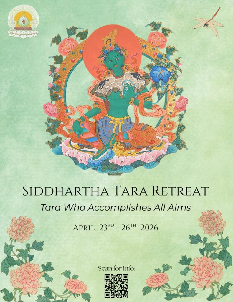 The Sadhana of Tara Who Fulfills All Aims (Siddhartha Tara Sadhana) is an extraordinary practice of Padmasambhava, revealed by Terton Chokgyur Dechen Lingpa as part of the Lamey Tukdrub Barche Kunsel cycle. During the practice we will also include recitations of the Twenty-One Praises to Noble Lady Tara, thus invoking the various manifestations of Tara, “The Mother of All Buddhas,” the swift embodiment of compassion.