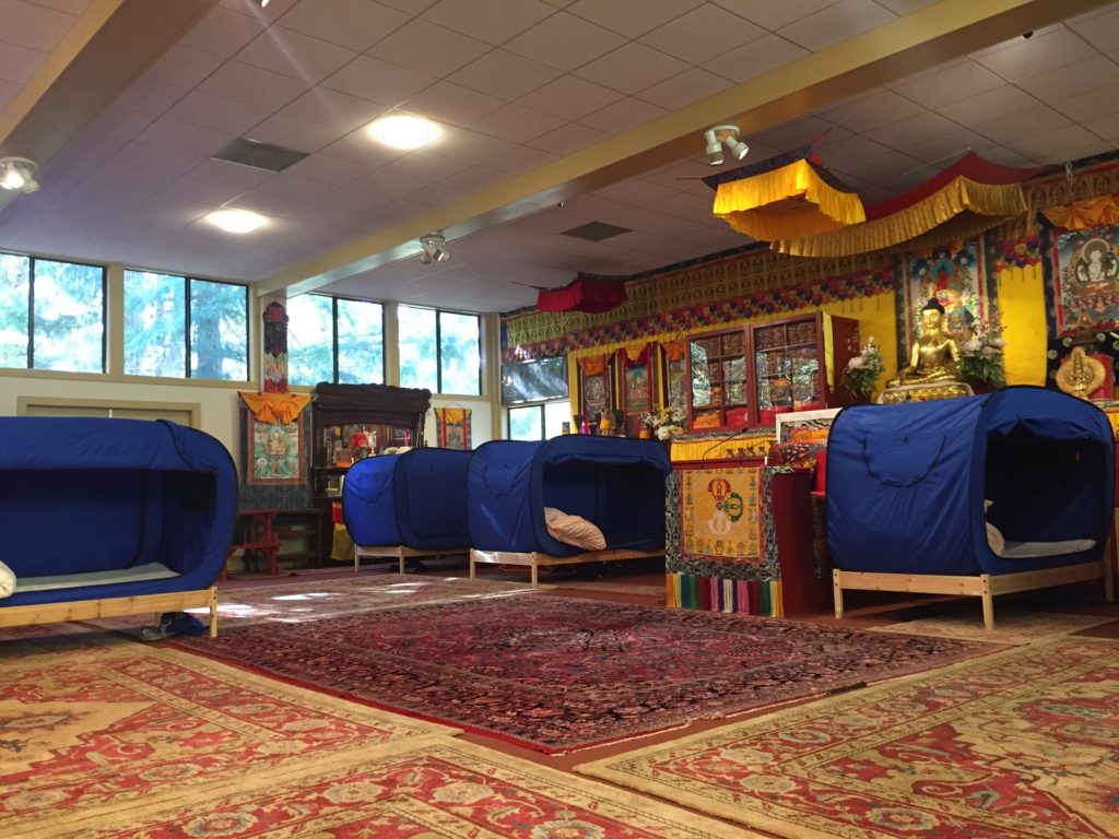 During group retreats in the colder months, our Buddha Hall is transformed into a mixed-gender dormitory for retreatants. Each person is provided with a pop-up privacy tent for sleeping, a twin-size mattress, and bedding. The Buddha Hall is equipped with heating and cooling for comfort. It’s just a short walk to the Shower House, restrooms, and central kitchen. Please note that this dorm also serves as a space for teachings and practices, so it remains a public area.